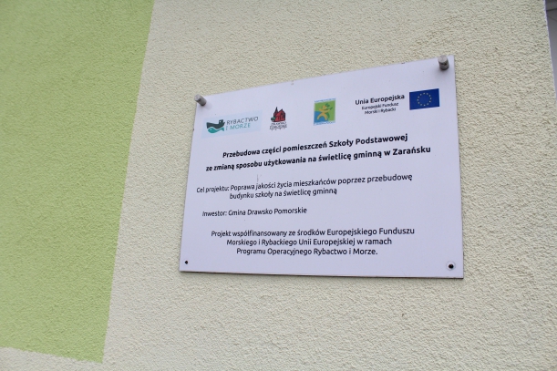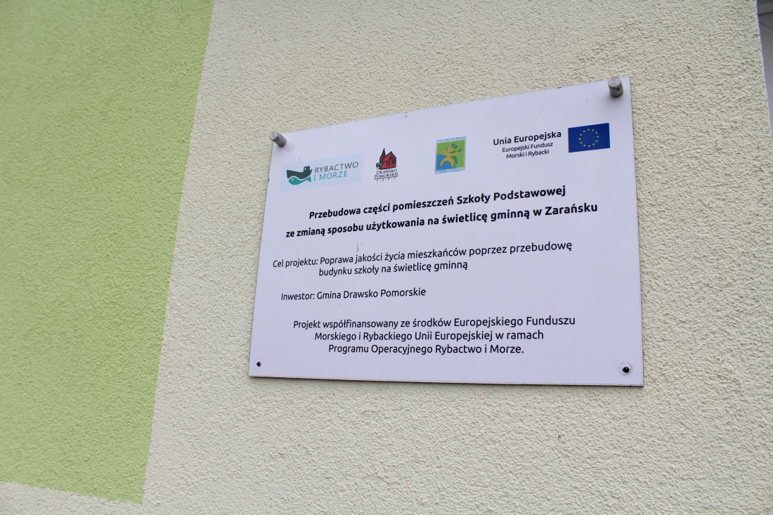 Opis - Dzięki pozyskaniu dofinansowania z Programu Operacyjnego „Rybactwo i Morze” gmina Drawsko Pomorskie zrealizowała inwestycję pn. „Przebudowa części pomieszczeń szkoły podstawowej ze zmianą sposobu użytkowania na świetlicę gminną w Zarańsku”. Było to budynek po byłej szkole w Zarańsku. Obecnie funkcjonuje jako nowoczesny obiekt służący lokalnej społeczności.